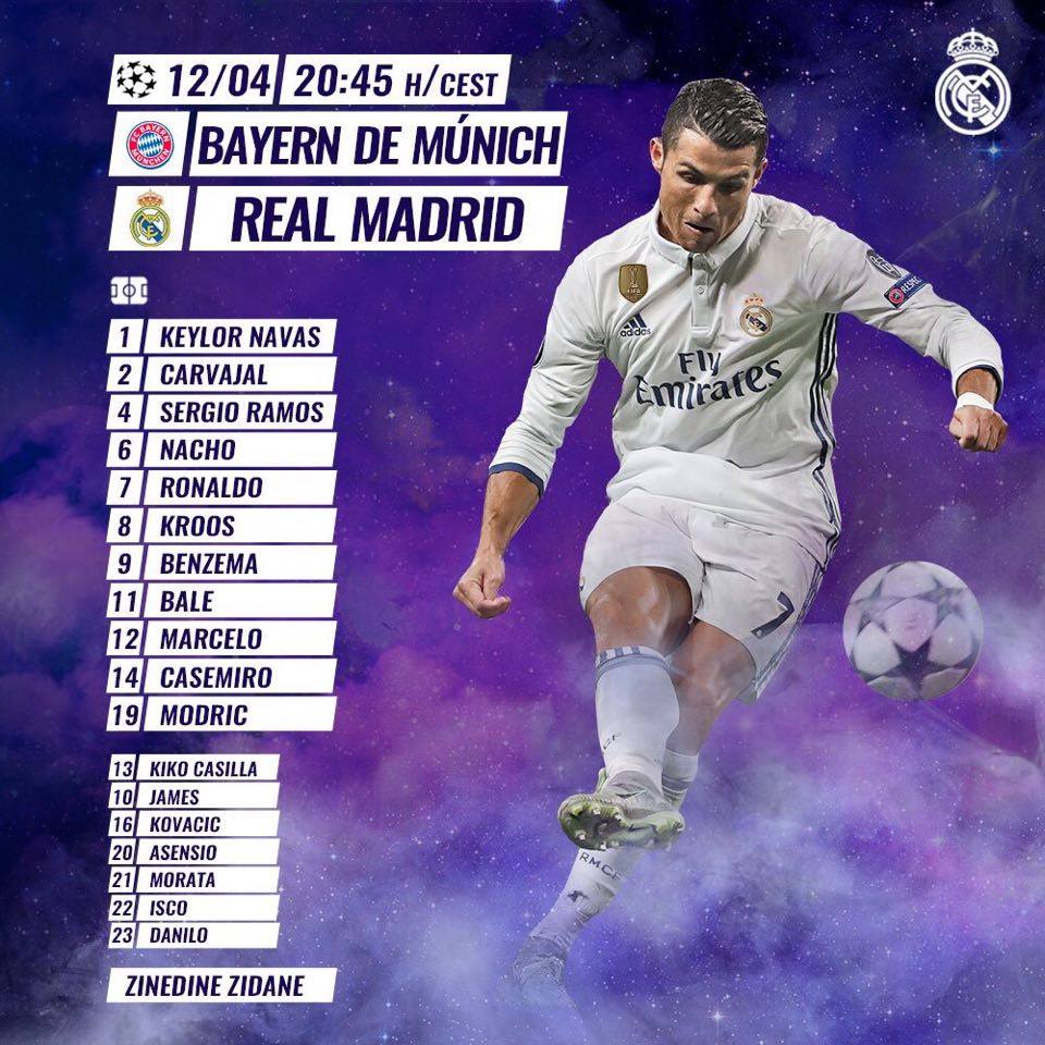 استقرّ زين الدين زيدان، المدير الفني لفريق ريال مدريد الإسباني، على تشكيلة فريقه التي تخوض مواجهة الليلة أمام بايرن ميونيخ في ذهاب الدور ربع النهائي لدوري أبطال أوروبا.