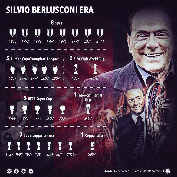 وببيع النادي، انتهت حقبة من تاريخ النادي استمرت لمدة 31 عاما، بدأت مع بيرلوسكوني عام 1986، شهدت إنجازات وألقاب لم يحصدها النادي في تاريخه كاملا، حيث توج خلالها ميلان بلقب الدوري 8 مرات، إلى جانب تتويجه بدوري أبطال أوروبا 7 مرات، آخرها عام 2007.