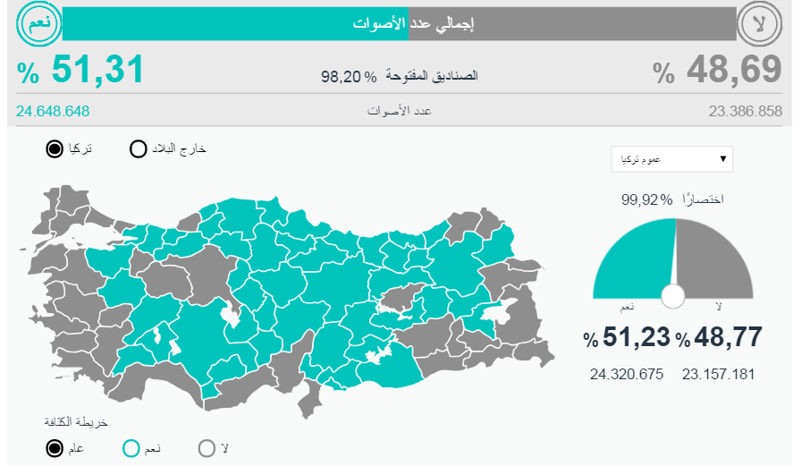 وبلغت نسبة التصويت بـ”نعم” لصالح التعديلات الدستورية 51.31% مقابل 48.69% لـ”لا” مع فرز 97% من الأصوات، بحسب وكالة أنباء “الأناضول” التركية الرسمية.