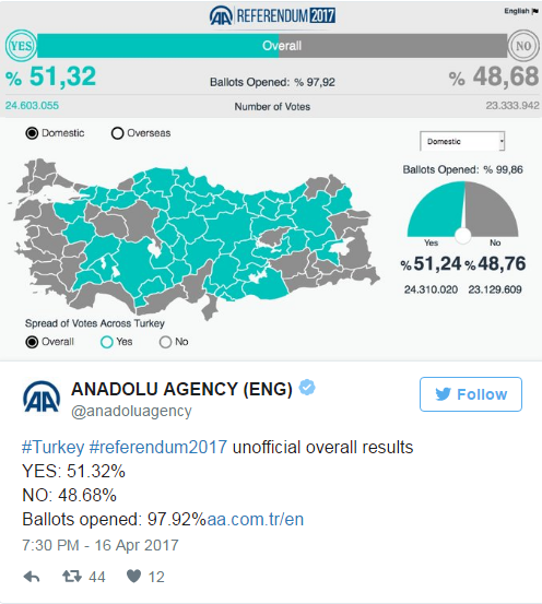 بالتصويت بـ”نعم”، نجح الرئيس التركي رجب طيب أردوغان في تغيير نظام الحكم في تركيا إلى “رئاسي تنفيذي”، وبنجاح كلمة “نعم” تم تغيير 18 مادة في الدستور.