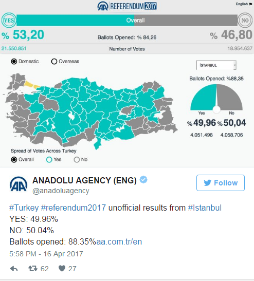 وقال المجلس الأعلى للانتخابات في تركيا اليوم إنه اتخذ قرارًا “غير مسبوق”، بالاعتبار بالأصوات التي لم تكن تحمل الختم الرسمي للمجلس، وفق ما أفادت وكالة الأنباء الروسية ورويترز. وأوضح هذا التحرك أن ناخبين اشتكوا من أنهم سلّموا بطاقات اقتراع دون ختم رسمي في الاستفتاء.