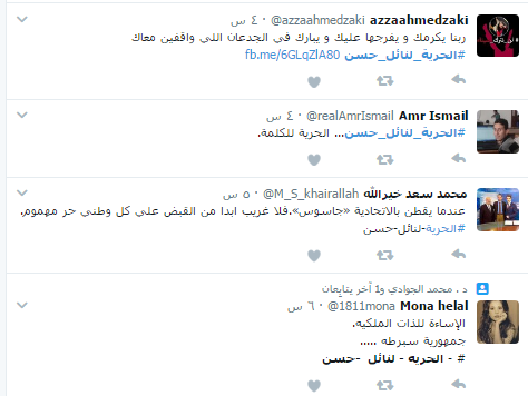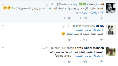 وعلق الكاتب والروائي المصري علاء الأسواني عبر حسابه على “تويتر” قائلًا: “نائل حسن، شاب سكندري اعتقلوه من بيته ولفقوا له قضية توزيع منشورات تسيء للرئيس. بدلًا من هذا العبث لو اهتم الأمن بالإرهاب لما تم تفجير الكنائس”.