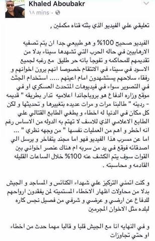 وأشار أبو بكر إلى أنه مجند يفتخر ويعرض هذه الفيديوهات لأهالي الشهداء من زملائهم، ولكنه وصل بالصدفة إلى يد قنوات الإخوان؛ ما جعلهم يستخدمونه أداة ضد القوات المسلحة، مؤكدًا التعتيم على صوت مقاتل مصري يقول: “مش أنت اللي كنت بتزرع الألغام” وتغطية صوته حتى لا يعلم المشاهد بشاعة الإرهابيين ويتعاطف معهم على طريقة أصحاب هذه القنوات.