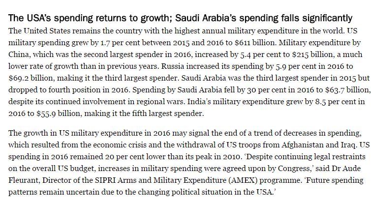 وعن السعودية، كان اللافت في التقرير تراجعها من المرتبة الثالثة في 2015 إلى الرابعة خلال عام 2016؛ حيث بلغت نسبة التراجع 30%، ليصل إلى 63.7 مليار دولار، بالرغم من استمرار مشاركتها في عديد من الحروب الإقليمية.