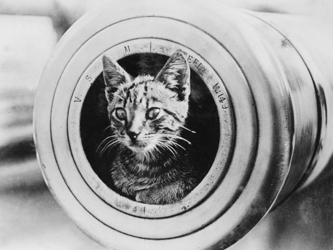 التقطت هذه الصورة عام 1916، لِقِطّة تعتبر “تميمة حظ”، وهي تطل من فوهة مسدس على متن سفينة بحرية أسترالية. وخلال السنوات التالية، بدأت تنتشر وسط تدريبات البحرية، وفي أكتوبر 1913 انضمت إلى المذكرات التي تحدّثت عن وحدة الأسطول الأسترالي الجديدة.
