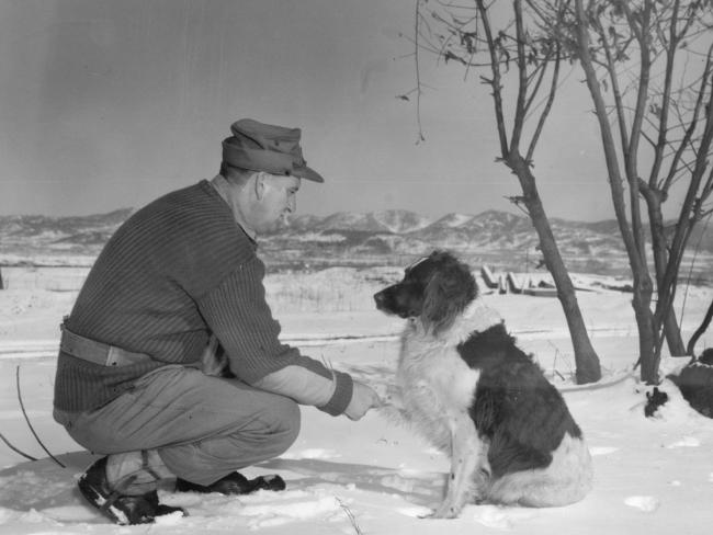 التقطت هذه الصورة للرقيب إريك كامبيل لوثر، من أعضاء الفوج الملكي الأسترالي، وهو يودّع كلبًا محاربًا في كوريا، للمصور فينس سويني في 13 مارس 1956.