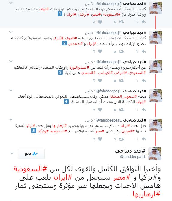 مختممًا تغريداته في هذا الشأن قائلًا إن التوافق الكامل والقويّ للسعودية وتركيا ومصر سيجعل من إيران تلعب على هامش الأحداث، وغير مؤثرة، وستجني ثمار إرهاربها.