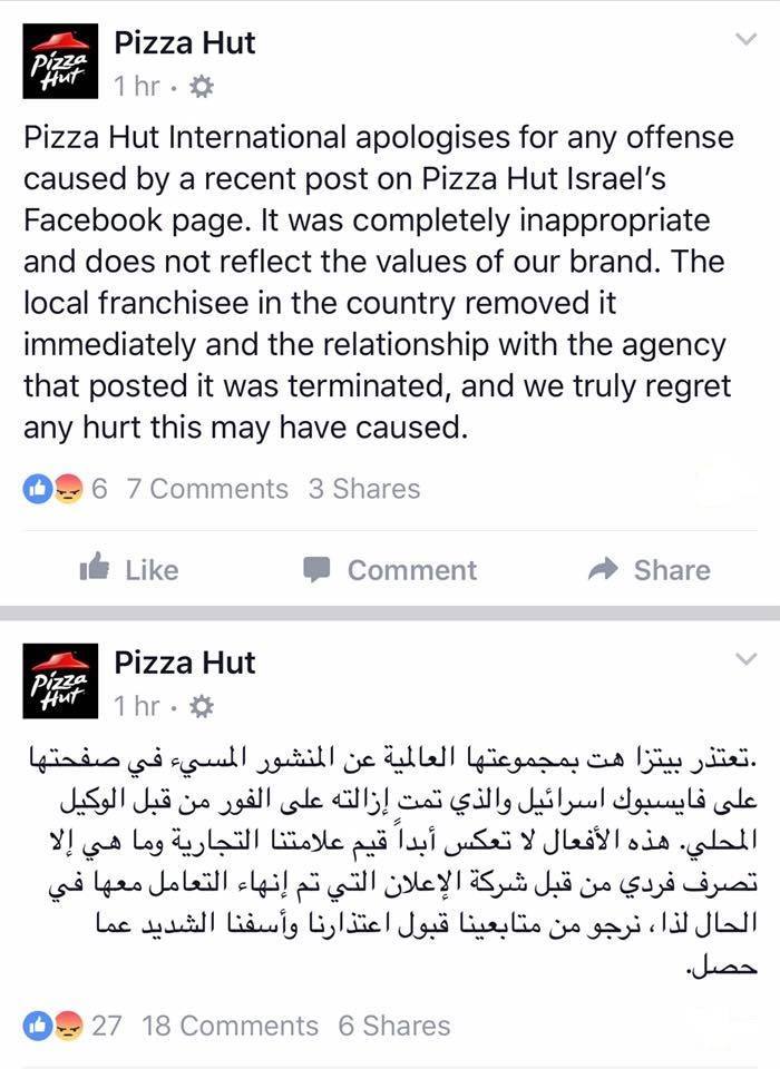 ونشرت “بيتزا هت” الأم عبر صفحتها الرسمية اعتذاراً قالت فيه: “تعتذر بيتزا هت بمجموعتها العالمية عن المنشور المسيء في صفحتها على (فيسبوك) إسرائيل، والذي تمت إزالته على الفور من قبل الوكيل المحلي، هذه الأفعال لا تعكس أبداً قيم علامتنا التجارية وما هي إلا تصرف فردي من قبل شركة الإعلان التي تم إنهاء التعامل معها في الحال، لذا: نرجو من متابعينا قبول اعتذارنا وأسفنا الشديد عما حصل”.