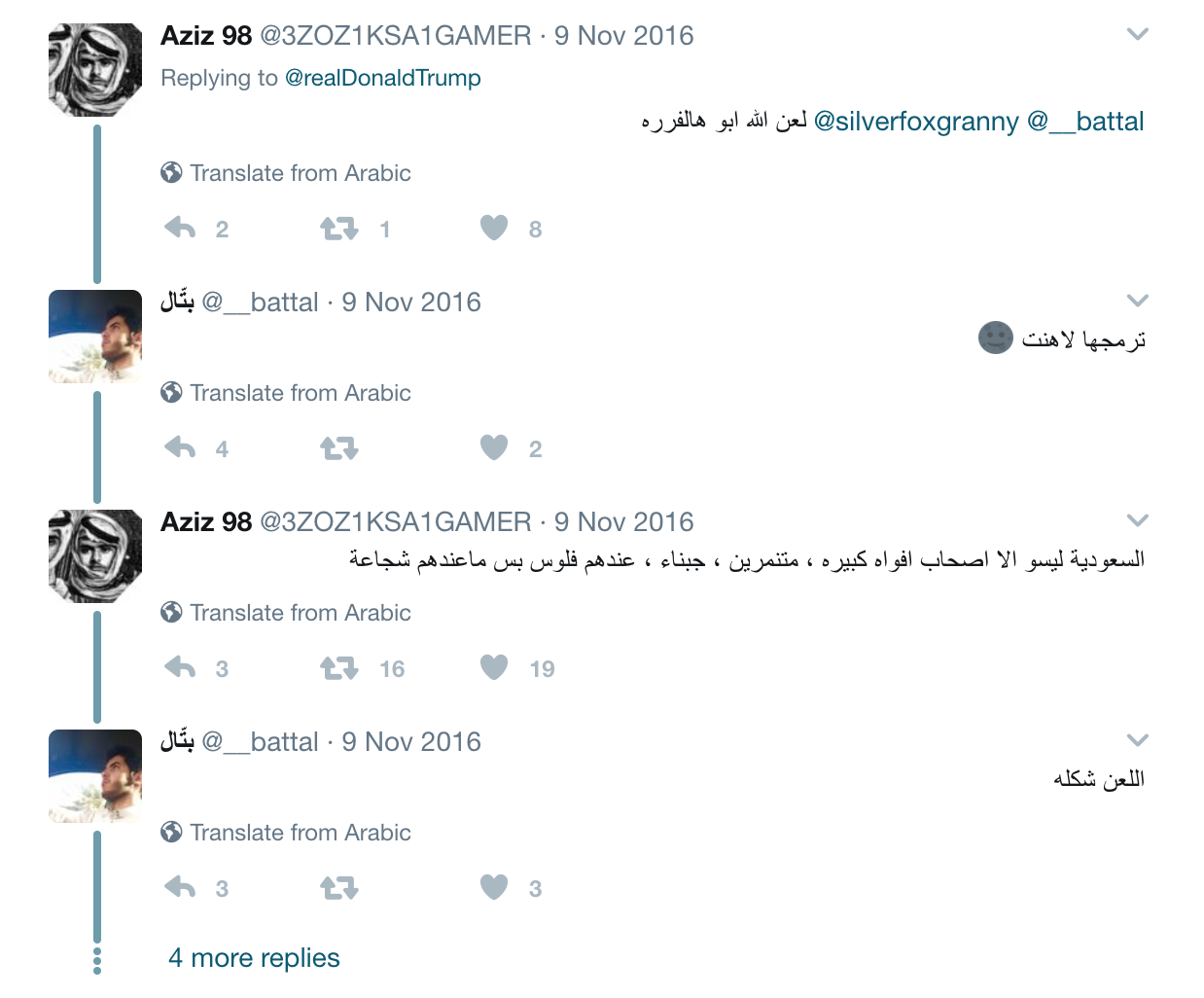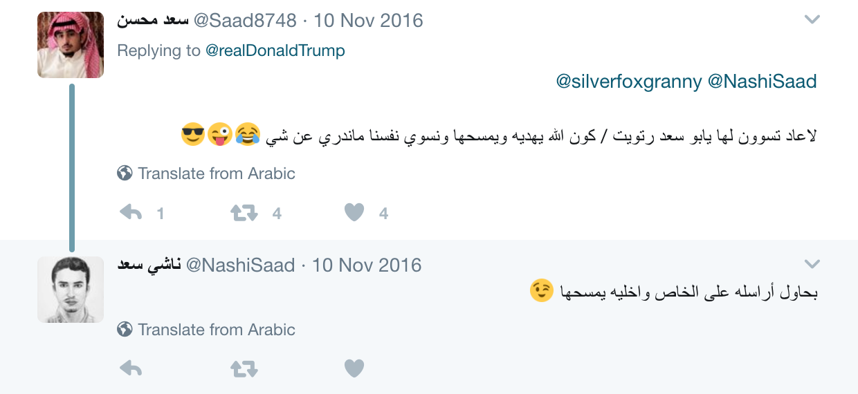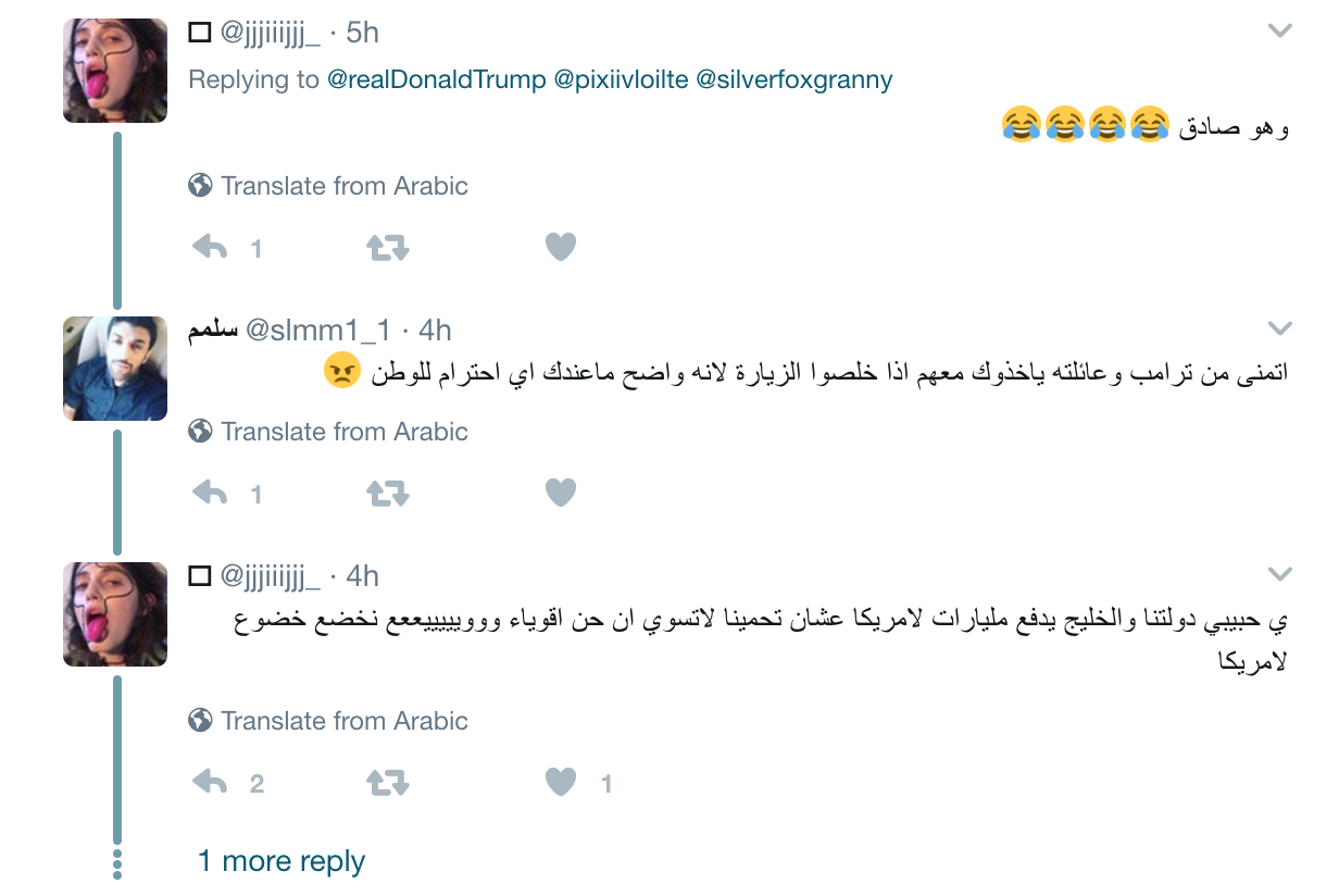 وفي السياق، شارك مغردون في الرد على تغريدة دونالد بصور تظهر الود والحفاوة المتبادلة بينه والملك سلمان في السعودية؛ عكس ما تدعو إليه تغريدته التي لا زالت على حسابه.