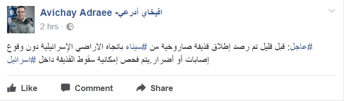 قال المتحدث الرسمي باسم الجيش الإسرائيلي، أفيخاي أدرعي، أن قذيفة صاروخية، خرجت من سيناء، استهدفت أراضي الاحتلال “الإسرائيلي”.