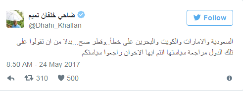 حينها ركز ضاحي هجومه على “قناة الجزيرة” واعتبرها عنوان سياسة قطر، قبل أن يهاجم الأخيرة صراحة في 22 مايو الجاري، وكتب في تغريدته: “الالتزام قضية أساسية؛ وإلا فإن الدولة غير الملتزمة ترعى الإرهابيين”، ودعا حينها إلى تطبيق قانون مكافحة الإرهاب على قناة الجزيرة، متهمًا إياها بـ”الترويج للإرهابيين”.