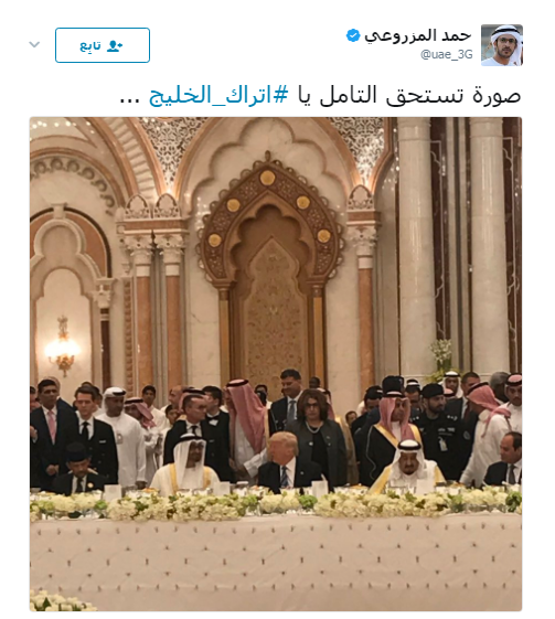 أما المغرد الإماراتي المثير للجدل حمد المزروعي، الذي دائمًا ما يدعو صراحة إلى إنهاء القضية الفلسطينية وإنشاء علاقات صريحة مع “إسرائيل”، فهاجم قطر في الحادي والعشرين من الشهر الجاري ونشر صورة لدونالد ترامب مع العاهل السعودي والسيسي، وقال: “صورة تستحق التأمل يا أتراك الخليج”.