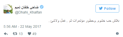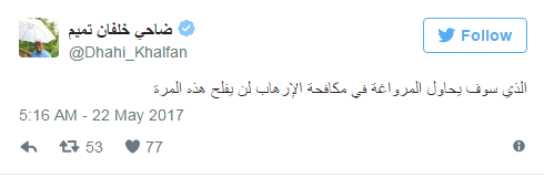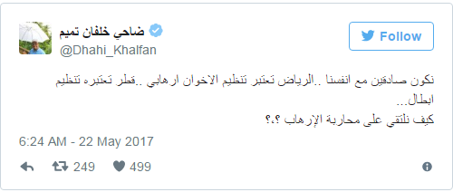 وفي الثاني والعشرين من الشهر الجاري ألمح الفريق ضاحي خلفان، نائب رئيس شرطة دبي، إلى خروج قطر عن مسار دول خليجية تؤيد قمة دونالد ترامب ومساعيهم لتوسيع نشاط مكافحة ما يسمى “الإرهاب”.