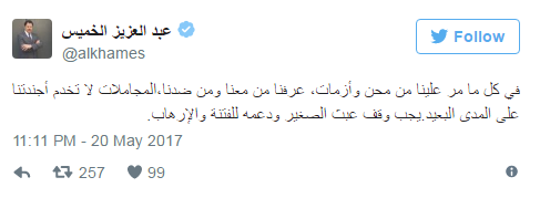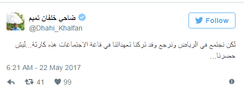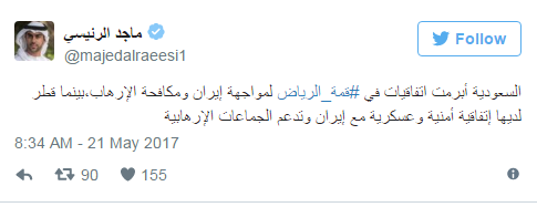 وقال المغرد الإماراتي ماجد رئيسي، المشهور بتغريداته ضد قطر، إبان عقد قمة الرياض: “السعودية أبرمت اتفاقيات في قمة الرياض لمواجهة إيران ومكافحة الإرهاب، بينما قطر لديها اتفاقية أمنية وعسكرية مع إيران، وتدعم الجماعات الإرهابية”.