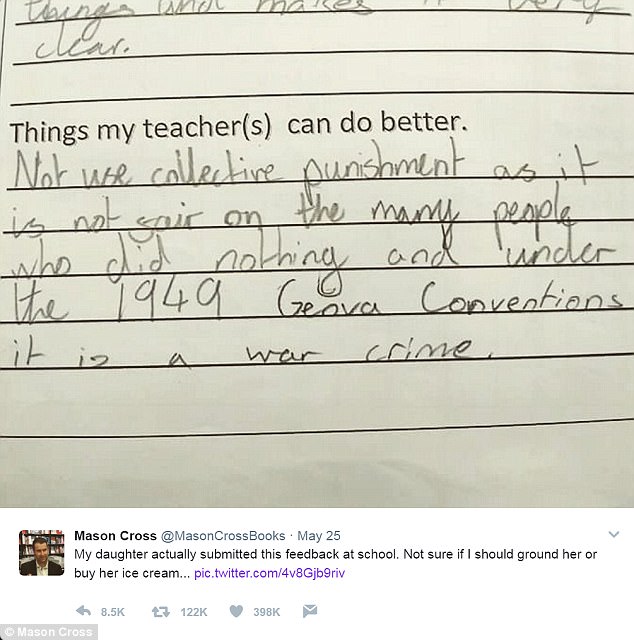 اتهمت طالبة أسكتلاندية مُعلّمها بارتكاب جريمة حرب داخل الفصل، بعد تطبيقه العقاب الجماعي على التلاميذ.