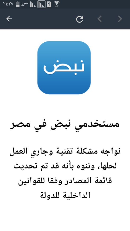 أعلن مسؤلو خدمة تطبيق نبض الإخبارية، عن توقف الخدمة بشكل مؤقت داخل مصر، وأرجعت الشركة المسؤولة في بيان لها، التوقف إلى مشكلة تقنية، قائلة: “نواجه مشكلة تقنية وجارٍ العمل على حلها”.