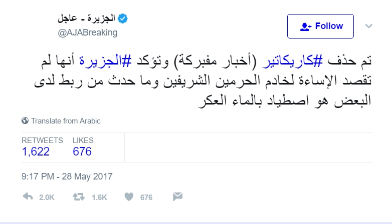 أعلنت شبكة الجزيرة، عبر حسابها على موقع تويتر، حذف كاريكاتير “أخبار مفبركة”، والذي اثار الجدل على مواقع التواصل الاجتماعي، مؤكدة أنها لم تقصد الإساءة إلى خادم الحرمين الشريفين.