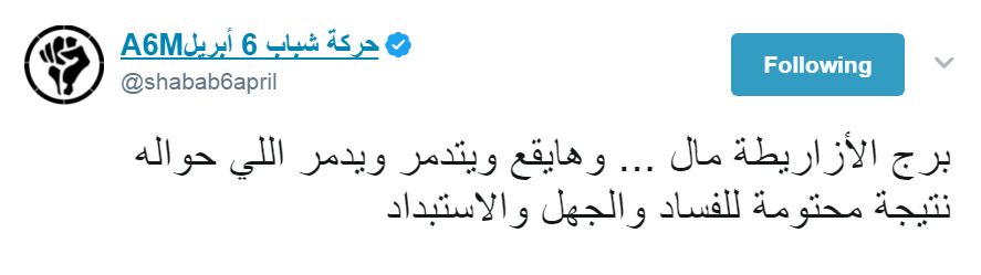 وجاء في تغريدة عبر حساب الحركة على موقع التدوين المصغر “تويتر”: “برج الأزاريطة مال، وهايقع ويتدمر ويدمر اللي حواليه، نتيجة محتومة للفساد والجهل والاستبداد”