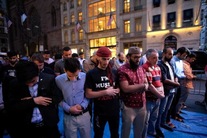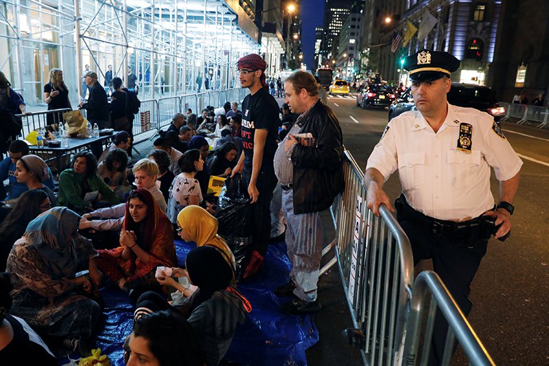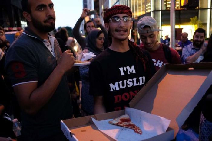 تناول ناشطون مسلمون الإفطار في سادس يوم من رمضان، أمس الخميس، أمام برج دونالد ترامب الشهير في حي مانهاتن بمدينة نيويورك، وانضم إليهم مارة ومتضامنون ومدافعون عن حقوق الإنسان.