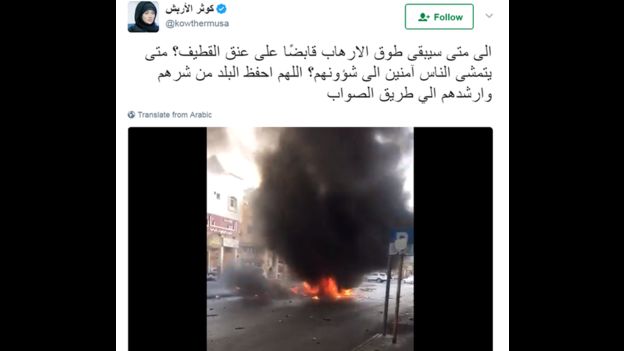 وغرّدت السياسية السعودية كوثر الأربش، عضو مجلس الشورى، مرفقة تغريدتها بمقطع فيديو يظهر السيارة المحترقة: “إلى متى سيبقى طوق الإرهاب قابضًا على عنق القطيف؟ متى يتمشى الناس آمنين إلى شؤونهم؟ اللهم احفظ البلد من شرهم وأرشدهم إلى طريق الصواب”.