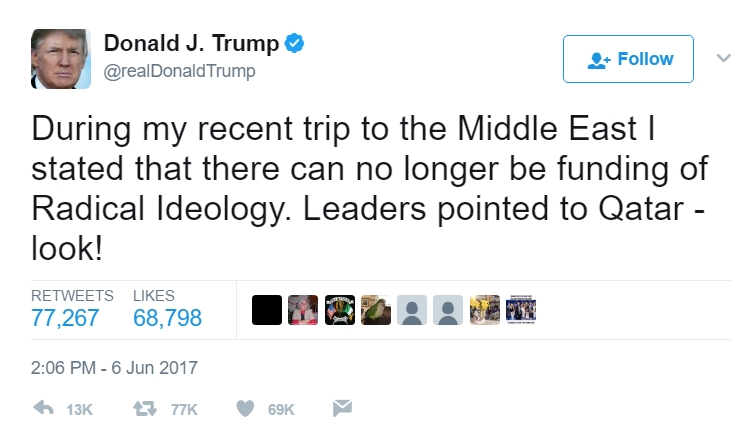 وأضاف ترامب في تغريدات أخرى: “من الجيد رؤية أن زيارتي للسعودية مع الملك (العاهل السعودي سلمان بن عبدالعزيز) و50 دولة تؤتي ثمارها. قالوا إنهم سيتخذون نهجاً صارماً ضد تمويل الإرهاب، وكل المؤشرات كانت تشير إلى قطر. ربما سيكون هذا بداية النهاية لرعب الإرهاب.”