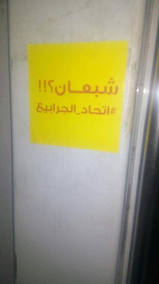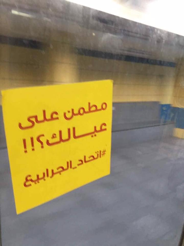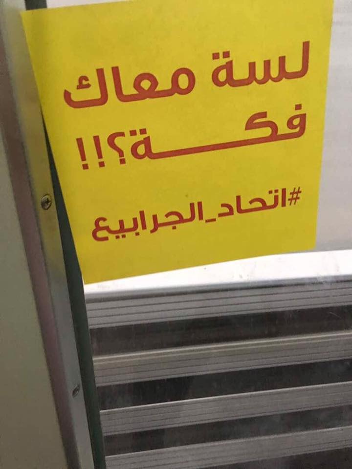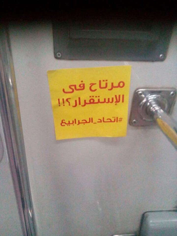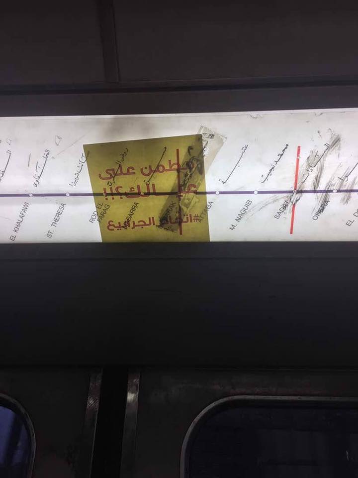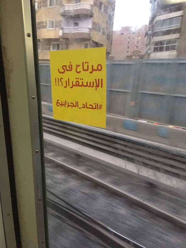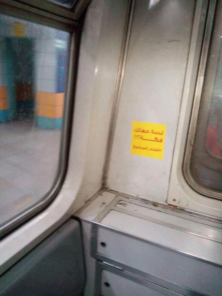 تداول عدد من رواد موقع التواصل الاجتماعي "فيس بوك" صورًا لعدد من الملصقات التي وضعها اتحاد أطلق على نفسه "اتحاد الجرابيع"، داخل عربات مترو الأنفاق.