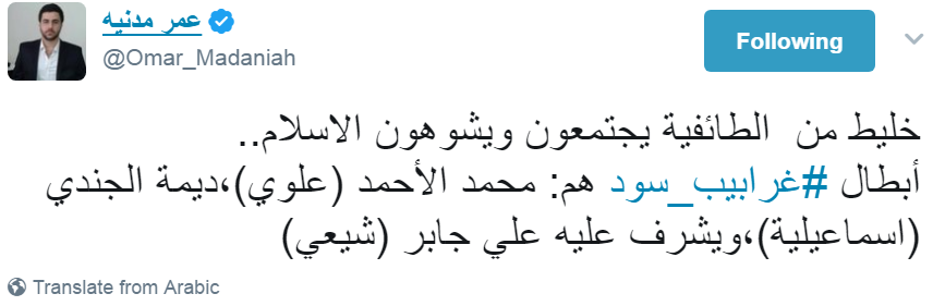 وقال الإعلامي السوري عمر مدنيه في تغريدة عبر حسابه على موقع التدوين المصغر تويتر: «خليط من الطائفية يجتمعون ويشوهون الإسلام، أبطال «غرابيب سود»، هم.. محمد الأحمد (علوي)، ديمة الجندي (اسماعيلية)، ويشرف عليه علي جابر (شيعي)»