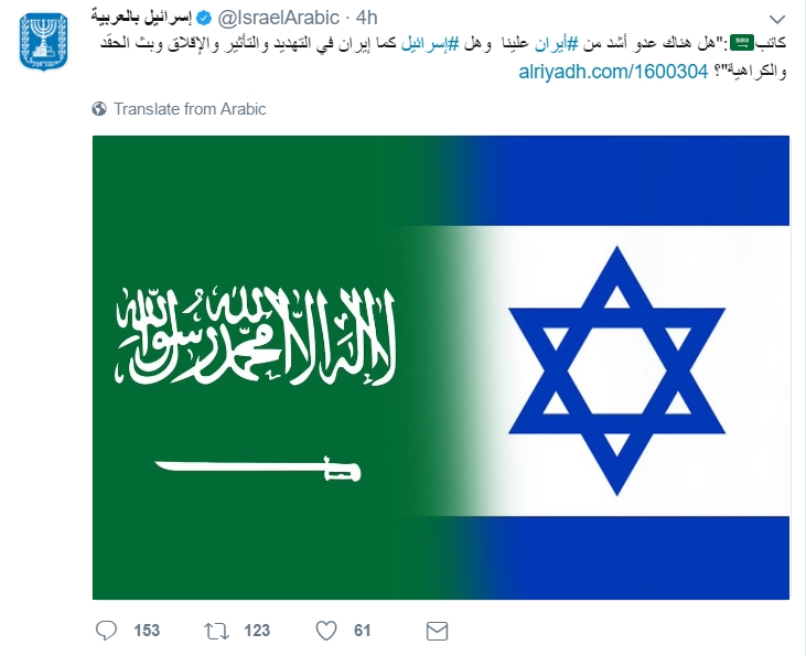 نشر حساب رسمي إسرائيلي، مقالات لكاتب سعودي، يدعو إلى إعادة العلاقات مع إسرائيل، مشيرا إلى أنها ليست أخطر عليهم من إيران.