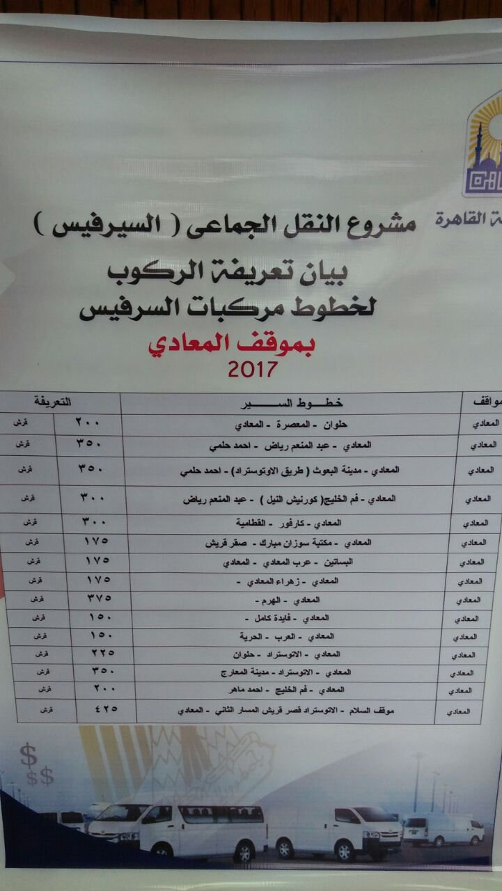 من جانبه، قال اللواء عمرو جمجوم رئيس جهاز تطوير وتجديد السيرفيس بالقاهرة، إنه تم تعليق اللافتات بمواقف العاصمة لتطبيق التسعيرة الجديدة، والتى أقرتها المحافظة لمنع الاحتكاك بين السائقين والركاب.