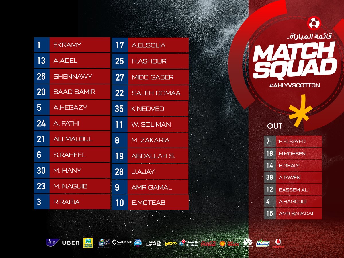 واستدعى حسام البدري، المدير الفني للأهلي، 21 لاعبًا، واستبعد قائد الفريق حسام غالي ومنحه راحة سلبية لمدة 48 ساعة؛ بناءً على طلبه بعد الأزمة التي نشبت بينهما في مباراة المصري الأخيرة.