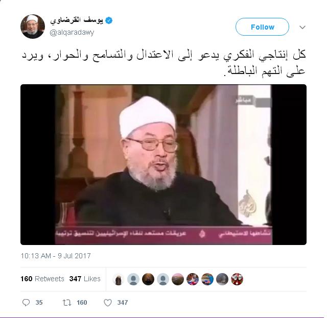 جاء تصريح القرضاوي في تغريدة عبر حسابه على موقع «تويتر» اليوم الأحد، مرفقًا مقطع فيديو لجزء من مقابلة أرشيفية معه على قناة «الجزيرة»؛ فيما يبدو ردًا على سؤال عن اتهامه بالدعوة إلى التطرف.