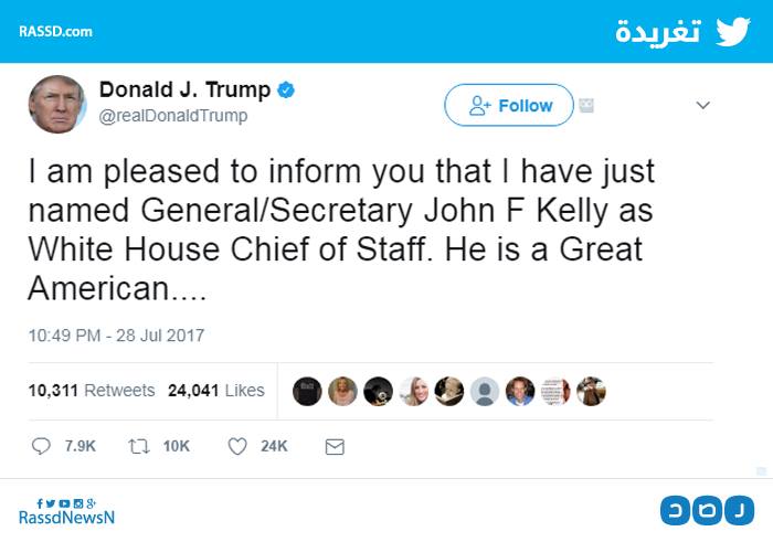 ومساء الجمعة، أعلن الرئيس الأميركي دونالد ترامب إقالة رئيس طاقم موظفي البيت الأبيض «رينس بريبوس» وعيّن بدلًا منه الجنرال جون كيلي؛ بعد قضية تسريب المعلومات من داخل البيت الأبيض.