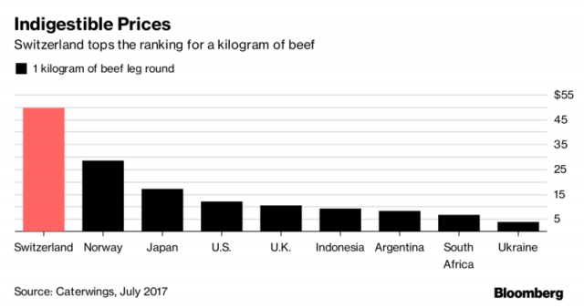 وبحسب التقرير، يبلغ ثمن كيلوجرام اللحم الأحمر في سويسرا 50 دولارًا، وهو أغلى سعر في العالم؛ لكن الحصول عليه يتطلب أجر ثلاث ساعات فقط للعامل السويسري غير الماهر.