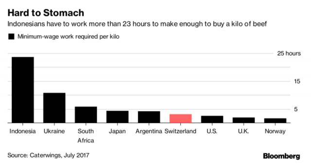 ويبلغ ثمن كيلو اللحم في إندونيسا تسعة دولارات فقط، ويحتاج الفرد هناك إلى العمل 23.6 ساعة ليتمكن من شرائه، بينما يحتاج النرويجي إلى العمل ساعتين فقط لشراء كيلو لحم.