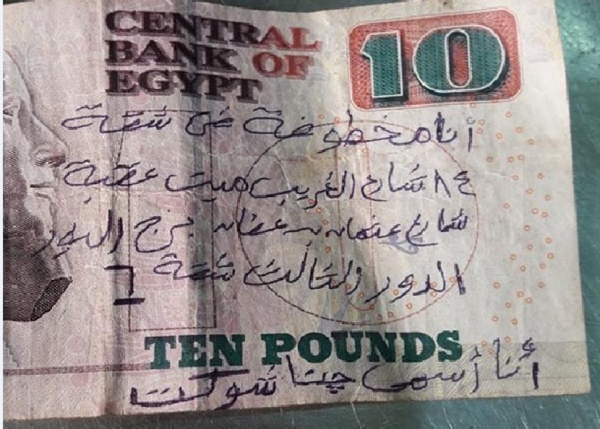 أثارت ورقة نقدية من فئة العشرة جنيهات الجدل على موقع التواصل الاجتماعي؛ بعد التقاطها ونشرها مكتوبًا عليها: «أنا مخطوفة في شقة 84 بشارع الغريب بميت عقبة، اسمي جنا شوكت».