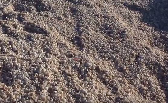 تنتمي هذه المليارات من الأصداف إلى نوع واحد من الرخويات التي تزدهر في المنطقة؛ نتيجة لعاملين أساسيان؛ أولهما أنّ موقع الشاطئ في الجزء الأعمق من خليج شاركي على شكل حدوة حصان مع أكبر بنك من الأعشاب البحرية في العالم، التي تحجب بدورها المدّ والجزر، والسبب الآخر إلى فرط الملوحة في المنطقة نتيجة هطول أمطار أقلّ من المياه المتبخرة.