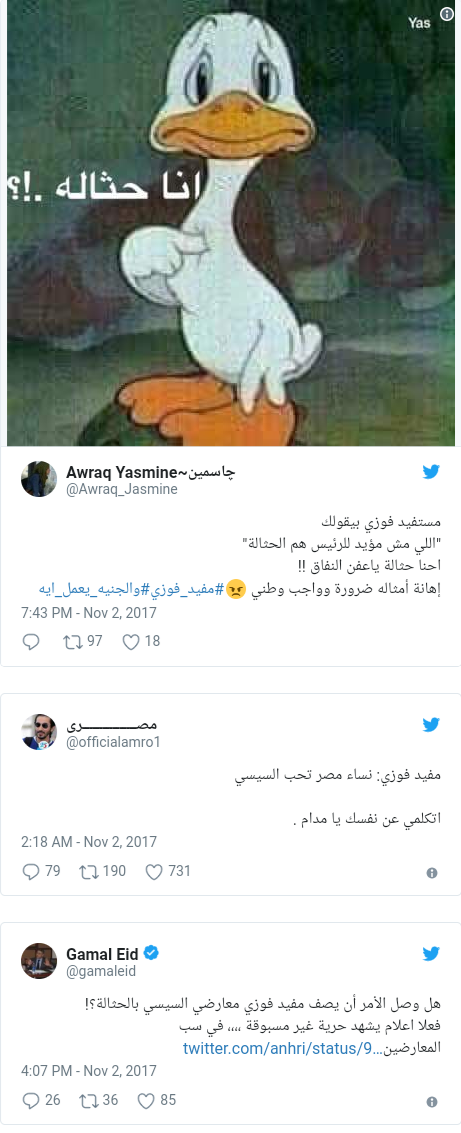فلم تمر أيام قليلة على تصريحات على عبدالعال، رئيس مجلس النواب، والتي طالب فيها من يعترض على النظام بمغادرة بالبلاد، حتى جاء مفيد فوزي أحد أبواق النظام الإعلامية، ووصف المعارضين بـ«الحثالة».