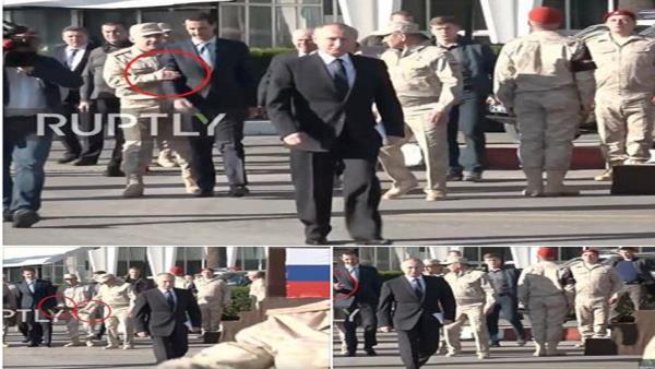 وظهر في الفيديو بوتين يسير أمام بشار الأسد وبقية الجنود بمسافة كبيرة، وعندما حاول الأسد اللحاق به، أمسكه الجندي من ذراعه، وهمس له بكلام ما، حيث هز الأسد برأسه ماتعني بالموافقة.