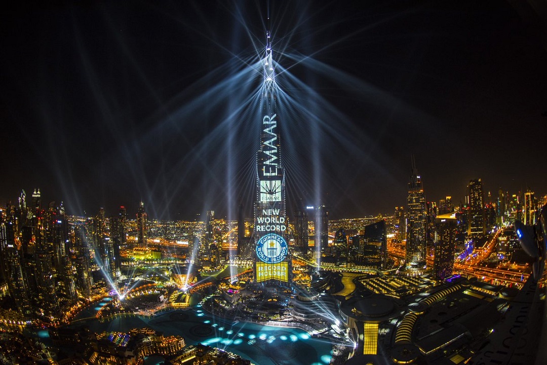 سجلت دبي، نفسها في موسوعة «جينيس» للأرقام القياسية، عن فئة «أكبر عرض صوتي وضوئي على مبنى واحد» في برج خليفة، في الوقت الذي غاب علم قطر من الاحتفالات على إثر الأزمة الخليجية.