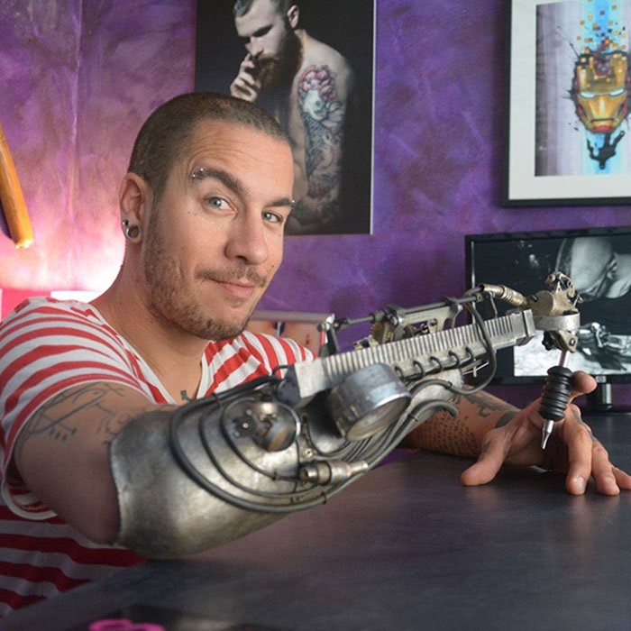 الفنان الفرنسي جي. سي. شيتين، لم يسمح لإعاقته بفقدان إحدى ذراعيه أن تمنعه من حلمه بأن يصبح من أشهر رسامي التاتو على مستوى العالم، فتمكن بهيئته تلك من استخدام الإبرة والحبر وانطلق في عالم تشكيل رسومات التاتو (يشكلها بنفسه)، وتبهر الجميع.