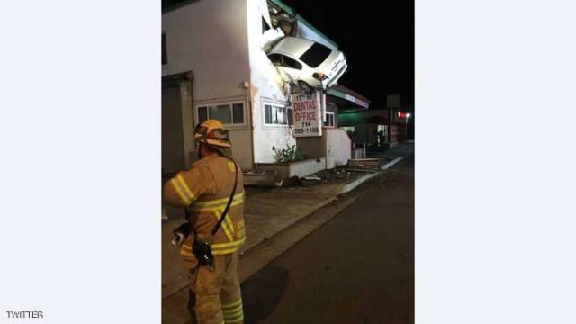 ونشرت السلطات المحلية صور الحادث على موقع التواصل الاجتماعي «تويتر»، وأثارت صورة السيارة العالقة في المبنى الدهشة بشأن طريقة وصولها إلى هذا الوضع الغريب.