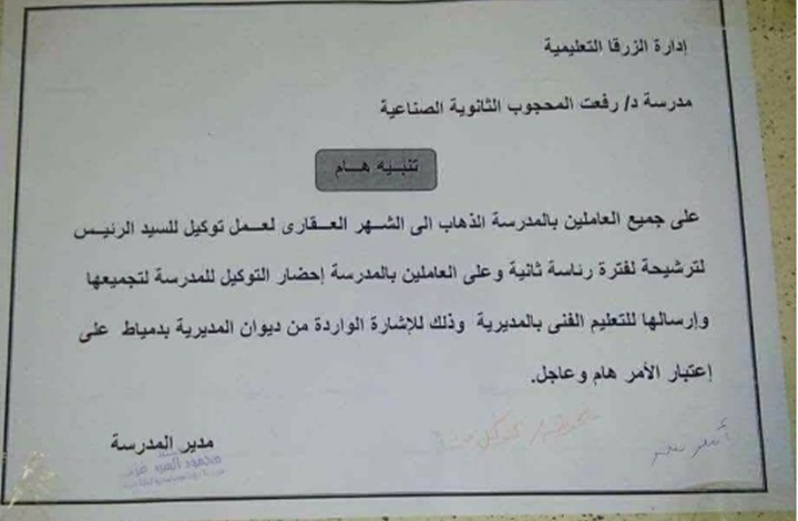 وتم تداول منشور منسوب لإدارة الزرقا التعليمية التابعة لمحافظة دمياط بشمال الدلتا، طالب مدير إدارة مدرسة رفعت المحجوب الثانوية مدرسي وموظفي المدرسة بسرعة التوجه لمكاتب الشهر العقاري؛ لعمل توكيلات لصالح السيسي؛ من أجل انتخابه لفترة رئاسة ثانية، على أن يتم تسليم التوكيل للمدارس التابعة لها لإرسالها إلى الجهات المعنية.
