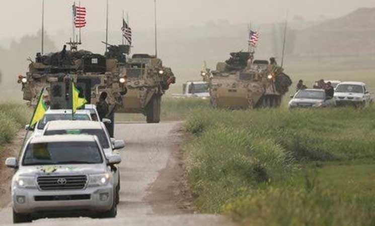 سيارات تابعة لوحدات حماية الشعب الكردية تتقدم مركبات عسكرية أمريكية في بلدة قرب الحدود مع تركيا يوم 28 أبريل نيسان 2017 - رويترز