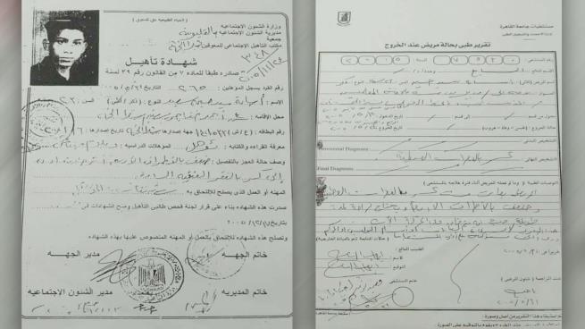وأضاف: «تم استخراج شهادة تأهيل لذوي الاحتياجات الخاصة وكارنيه (بطاقة) إعاقة ومستندات رسمية من وزارة الشؤون الاجتماعية من عام 2005، اعتبر (أسامة حسين) على أساسها بأنه غير لائق للتجنيد وفق كشف طبي من القوات المسلحة».