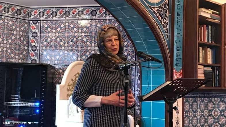 ونشر الحساب الرسمي لمجلس مسلمي بريطانيا صورة لرئيسة الوزراء البريطانية، تيريزا ماي، وهي ترتدي حجابا، أثناء القائها كلمة مسجد ميدينهيد في مقاطعة باركشير، جنوب شرقي انجلترا.