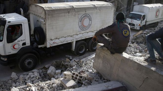 انسحبت القافلة الأممية الإغاثية، إلى الغوطة الشرقية المحاصرة في سوريا، دون أن تستكمل إفراغ حمولتها؛ جراء القصف المستمر من قبل النظام السوري وروسيا والذي خلف مذبحة جديدة أودت بنحو 90 مدنيا.