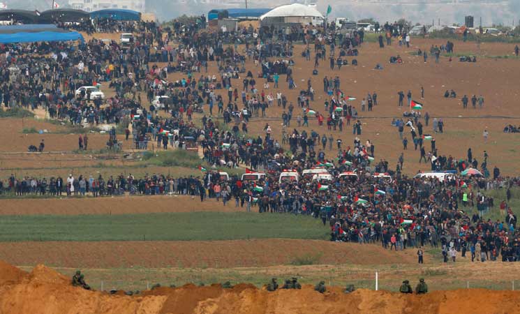 انطلق، صباح اليوم الجمعة، في قطاع غزة، آلاف الفلسطينيين في مسيرات متوجهة نحو السياج الفاصل بين القطاع وإسرائيل؛ تلبية لدعوة وجهتها فصائل فلسطينية بمناسبة الذكرى الـ42 لـ«يوم الأرض».