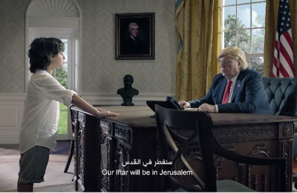 ويظهر في الإعلان طفل يخاطب شخصا يجسّد دور رئيس الولايات المتحدة الأميركية دونالد ترامب، بقوله: «سيدي الرئيس، رمضان كريم.. وأنت مدعو على الإفطار»، ثم يلتقي الطفل بشخصيات كل من الرئيس الروسي فلاديمير بوتين، والمستشارة الألمانية أنجيلا ميركل، والزعيم الكوري الشمالي كيم جونغ أون، والأمين العام للأمم المتحدة أنطونيو جوتيريش، إلى جانب مشاهد قوارب الموت، والمباني المهدمة.