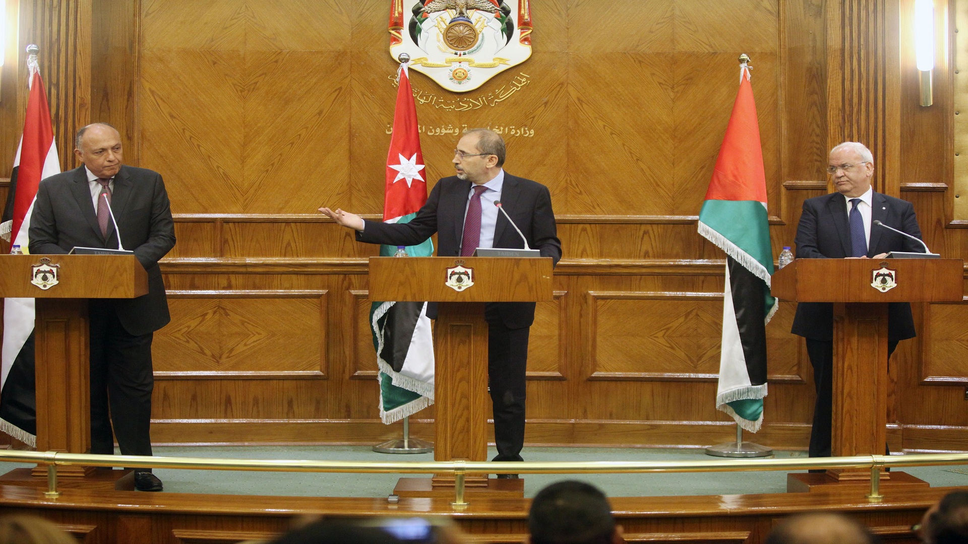 أجمع وزيرا خارجية مصر سامح شكري، والأردن أيمن الصفدي، وأمين سر اللجنة التنفيذية لمنظمة التحرير الفلسطينية، صائب عريقات، على تكثيف التشاور والتنسيق بين الدول الثلاث خلال الفترة المقبلة؛ من أجل متابعة تطورات الأوضاع في الأراضي الفلسطينية، وتنسيق المواقف بشأن الجهود المبذولة على الساحة الدولية لدعم القضية الفلسطينية، وتكوين أفق سياسي واضح للتسوية السلمية.