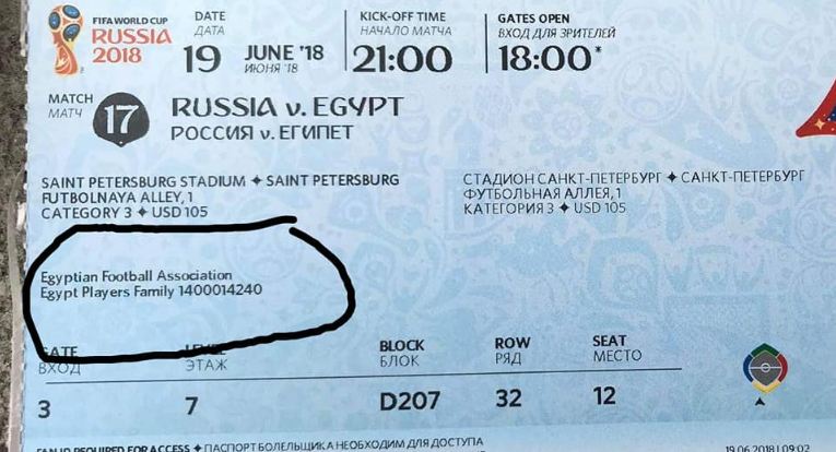 وأضاف «وبعد التواصل معه ومقابلته بمقر إقامة المنتخب المصري اكتشف أنه نجل أحد كبار المسؤولين باتحاد الكرة المصري كما اكتشف أن التذكرة المباعة مخصصة لأسر اللاعبين المشاركين في المونديال».